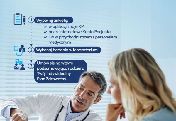 Jeśli masz ukończone 20 lat, skorzystaj z bezpłatnego programu profilaktycznego „Moje Zdrowie” – cyklicznego bilansu zdrowia dorosłego człowieka. Program ten jest realizowany przez przychodnie podstawowej opieki zdrowotnej (POZ) i ma na celu wczesne wykrywanie niekorzystnych zmian w organizmie. Kto może wziąć udział w programie? Każda osoba, która ukończyła 20. rok życia, może skorzystać z programu: co 5 lat (jeśli ma 20–49 lat) co 3 lata (jeśli ma 50 i więcej lat) Jeśli skorzystaliście programu Profilaktyka 40 PLUS, możecie przystąpić do programu Moje Zdrowie po roku od ostatnich badań. Co zyskasz, biorąc udział w programie? Lepszą kontrolę nad swoim zdrowiem dzięki regularnym badaniom. Wczesne wykrycie groźnych chorób, co zwiększa szanse na skuteczne leczenie. Indywidualne podejście i spersonalizowane porady profilaktyczne. Jak to działa? 1. Wypełnij ankietę – zawiera pytania o: wykształcenie i warunki socjalne dane antropometryczne (waga, wzrost) występowanie w rodzinie chorób cywilizacyjnych (udar, zawał) oraz nowotworowych (rak piersi, jajnika, trzonu macicy, jelita grubego i odbytnicy, żołądka, nerki) styl życia (dieta, aktywność